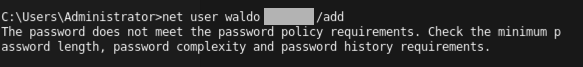Find the "net user" command shown below, which attempted to set a password on the "waldo" account that violated the complexity requirement.