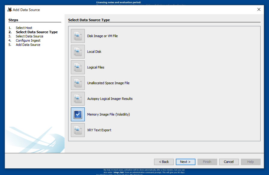 At step 2. Select Data Source Type, click "Memory Image File (Volatility)", as shown below.