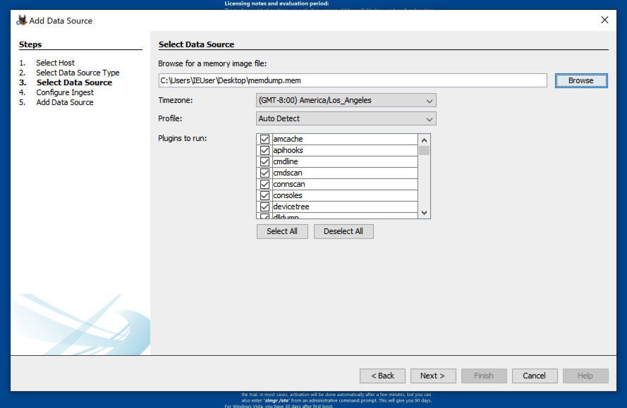 At step 3. Select Data Source, click the Browse button and navigate to the memdump.mem file, as shown below.