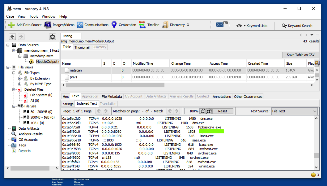 In the netscan section, find the name of the executable listening on port 8080, covered by a green rectangle in the image below.