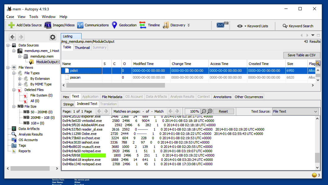 In the pslist section, find the name of the executable covered by a green rectangle in the image below.