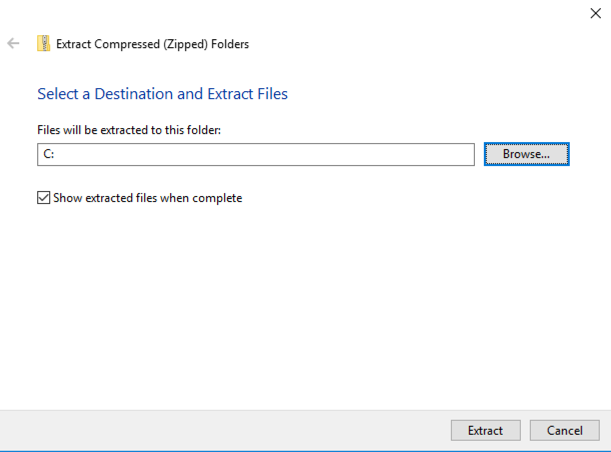 Right-click the downloaded file and click "Extract All..". In the "Extract Compressed (Zipped) Folders" box, enter a path of C:, as shown below. Click Extract.