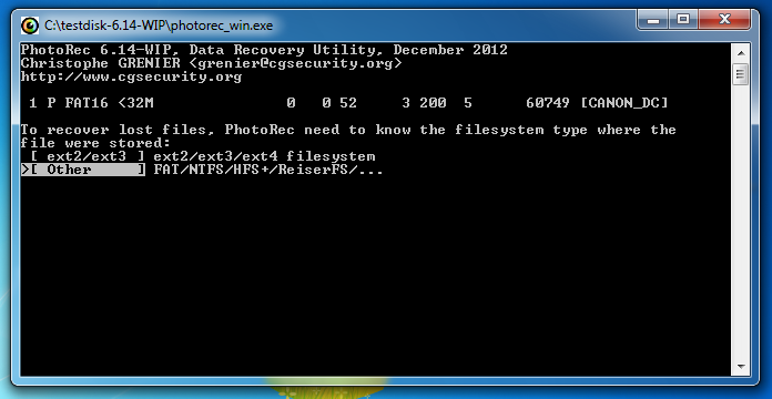 The next window asks what the file system is. It's usually FAT for Canon SD cards, so press Enter to accept the default choice.