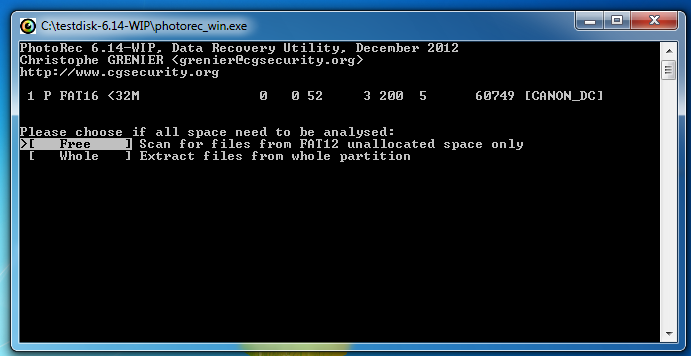 Click in the Photorec window, and press Enter to accept the default selection of the nps-2009-canon2-gen6.dd file.