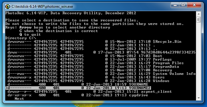 The next window asks where to store the recovered files. This is a really clumsy interface--press the left-arrow key once on the keyboard to move to C: and press the down-arrow key till the C:\YOURNAME2 folder is highlighted, as shown below. Then press Enter.