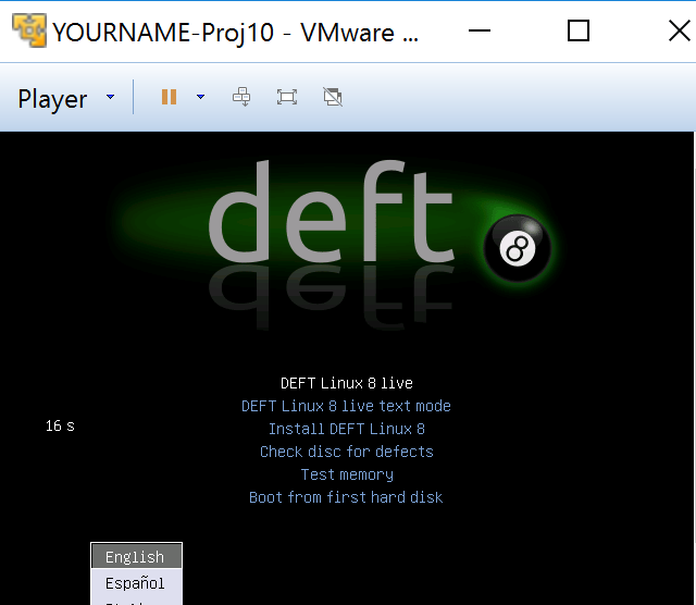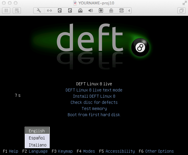You should see a DEFT bootup screen, as shown below. If you don't, you need to increqse the Vmware boot delay and change the BIOS boot order.