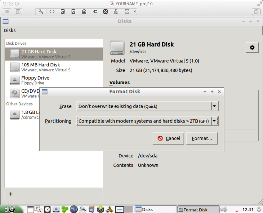 A box pops up, as shown below, asking whether to erase the disk and what partitioning to use.
