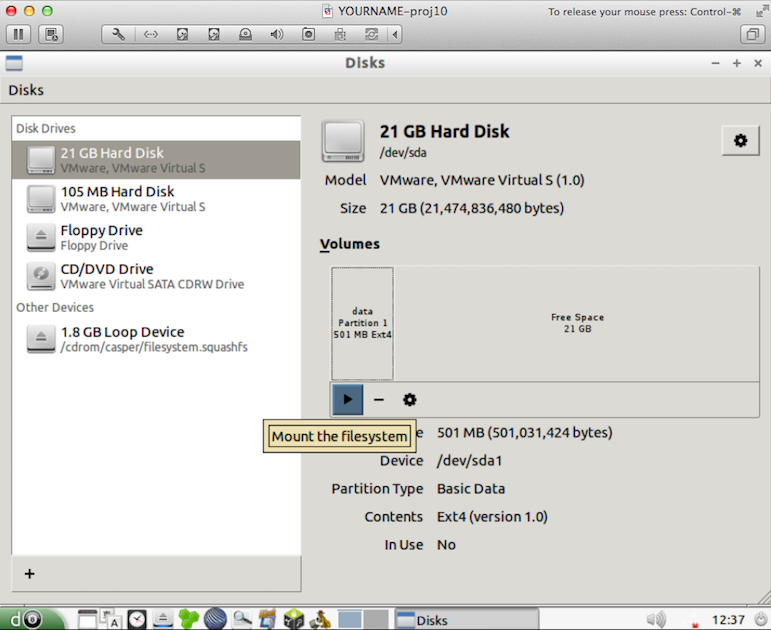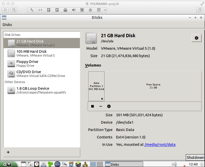 Now the lower right pane shows In Use "Yes, mounted at /media/root/data", as shown below.