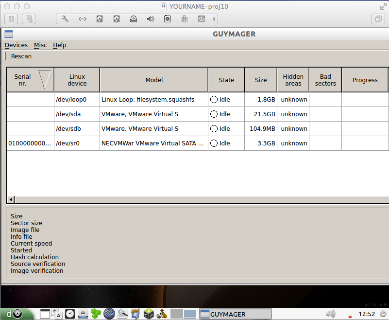 Guymager opens, with a window that doesn't fit on the desktop very well.