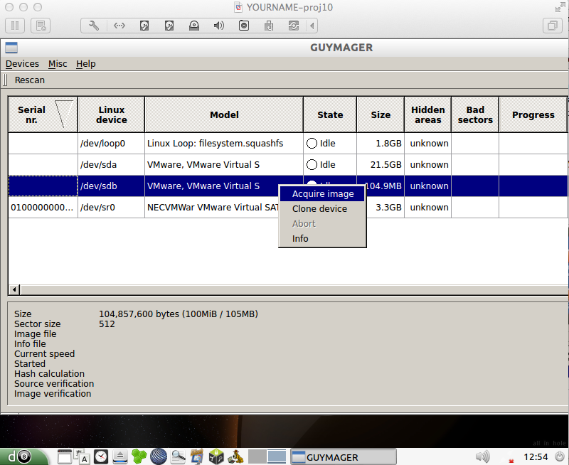 In Guymager, right-click the drive with a Size of 104.9MB and click "Acquire image", as shown below.