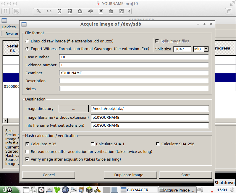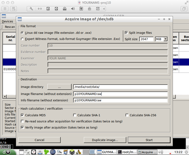In the "Acquire Image of /dev/sdb" window, make these entries: