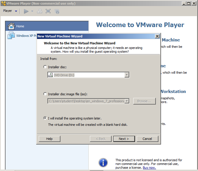 In the "New Virtual Machine Wizard", click the "I will install the operating system later" button, as shown below. Click Next.