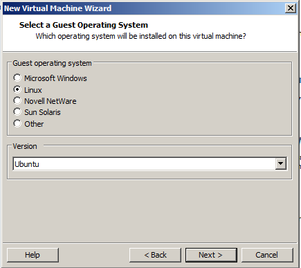 In the "Select a Guest Operating System" box, select Linux and Ubuntu, as shown below. Click Next.