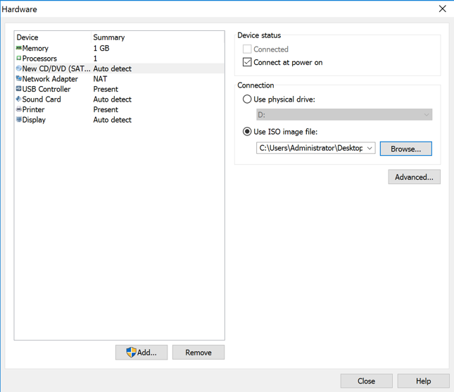 In the Hardware box, in the left pane, click "New CD/DVD". In the right pane, click "Use ISO image file". Click the Browse... button and navigate to your deft-8.2.iso file, as shown below.