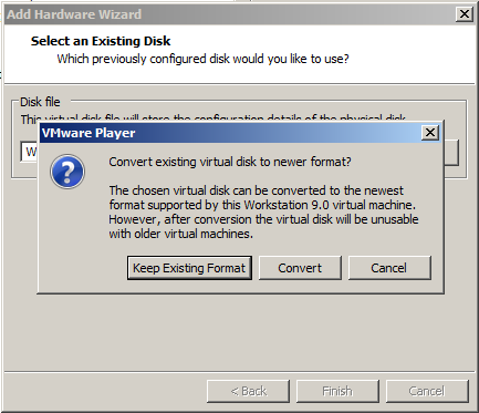 A box pops up asking if you want to 'Convert existing virtual disk to newer format?", as shown below.