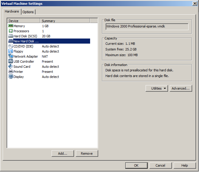 The "Virtual Machine Settings" box now shows a "New Hard Disk", as shown below.