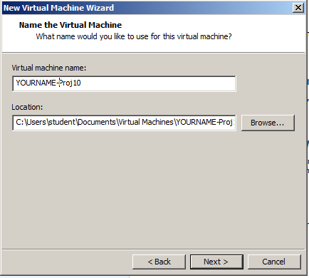 In the "Name the Virtual Machine" box, enter a Virtual machine name of YOURNAME-Proj10 as shown below.