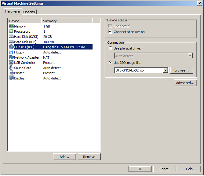Click the Browse button, navigate to your BT5R3-GNOME-32.iso file, and double-click it.