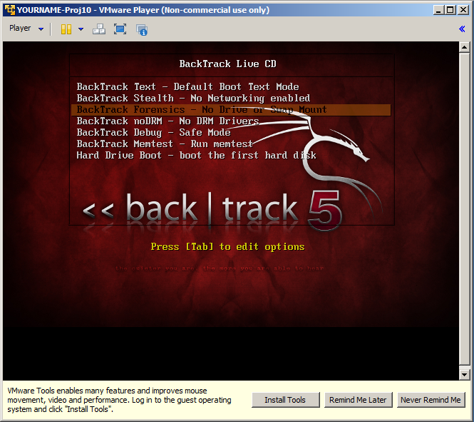 Click in the VM and use the down-arrow key to highlight the third item: "Backtrack Forensics" as shown above.