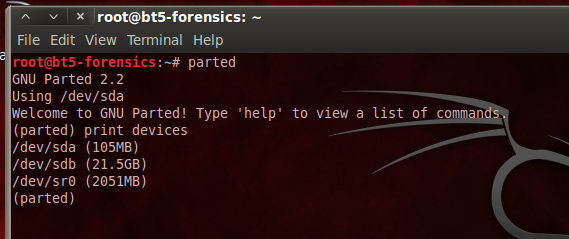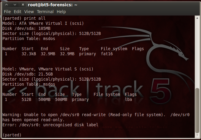 You should see a 32.9 MB partition on the evidence drive (/dev/sda), and a 500 MB partition on the empty drive (/dev/sdb).