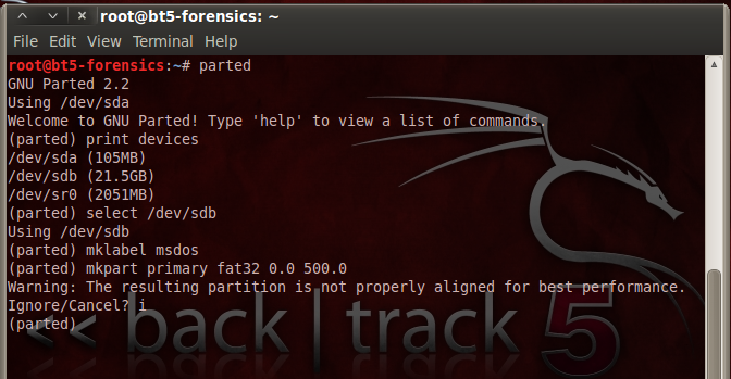 A message appears, saying: "The resulting partition is not properly aligned for best performance". Type i and press Enter, to ignore this warning.