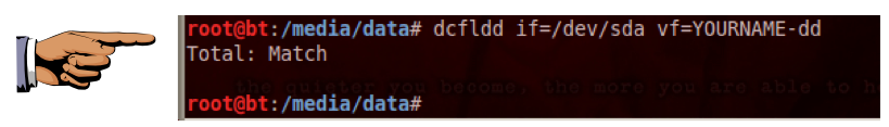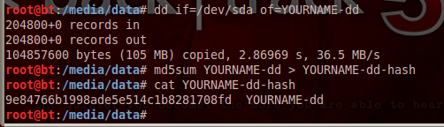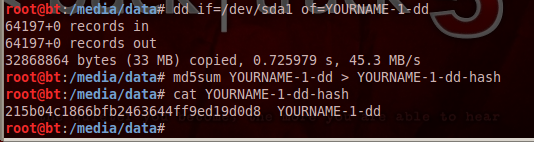 The dd command copies data from the evidence drive to a file named YOURNAME-dd. (Replace YOURNAME with your own name).