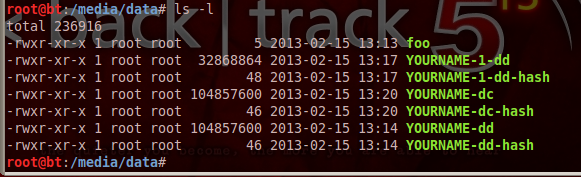 The directory shows the two acquisition files YOURNAME-dd and YOURNAME-dc. They are the same size. In fact, they are identical, because the md5 hashes match.