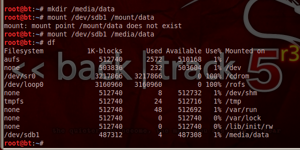 These are the missing steps in the classroom demo on 2-14-13. The earlier version of Backtrack I used previously automatically mounted the filesystem.