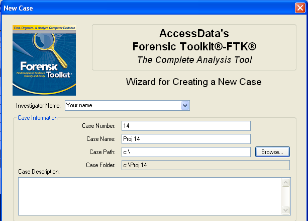 In the screen titled "Wizard for Creating a New Case", fill in the fields as shown below, replacing "Your Name" with your own name. Click Next.