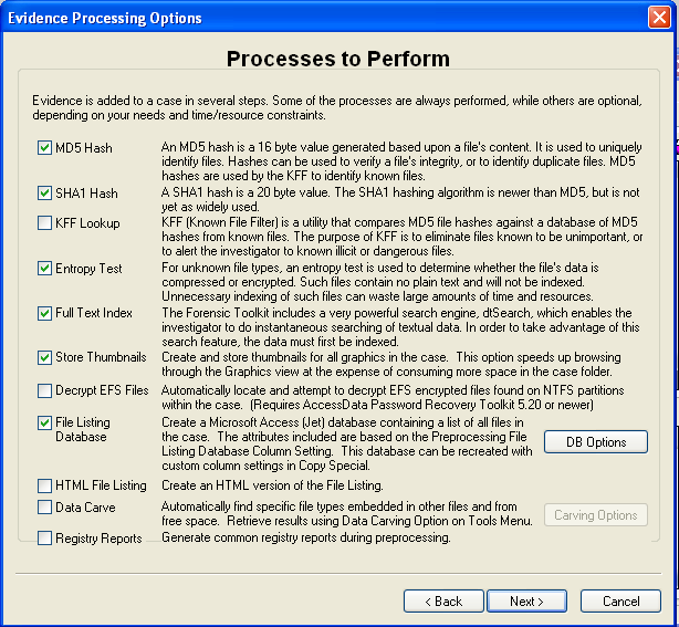 In the screen titled "Processes to Perform", deselect "KFF Lookup" and "Decrypt EFS Files", because those features won't work in the demo version, as shown below. Click Next.