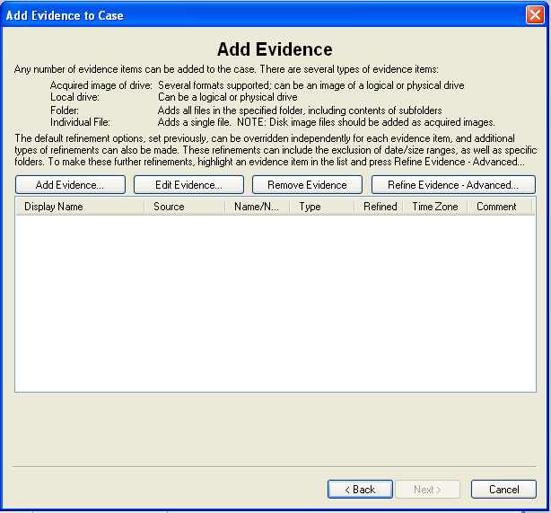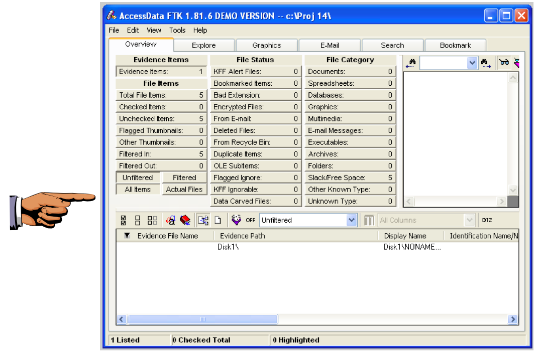 You should now see a screen like that shown below, showing "Evidence Items: 1" in the upper left portion of the window.
