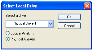 In the "Select Local Drive" box, click "Physical Analysis" and select the drive "Physical Drive 1", as shown below. Click OK.