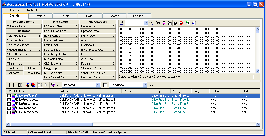 In the bottom pane of the FTK window, click "DriveFreeSpace1". The upper right corner now shows a hexadecimal view of the bytes in that file, as shown below.