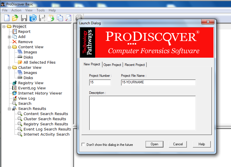 In the "Launch Dialog" box, enter a "Project Number" of 15 and a "Project File Name" of 15-YOURNAME, replacing "YOURNAME" with your own name, as shown below: