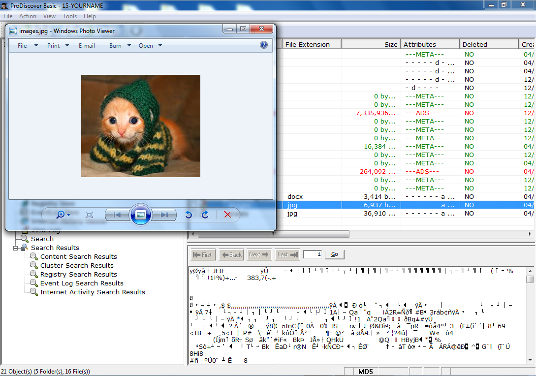 Notice the ASCII view in the lower right pane of ProDiscover. This shows the image bytes. JPEG images begin with a header including the ASCII text "JFIF", as shown below.