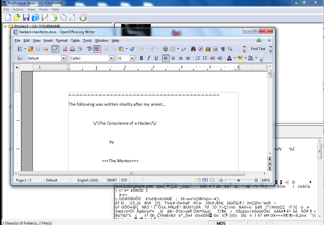 The lower right pane displays the file contents in ASCII, as shown below. Since this is a .docx file, the contents are not easy to read in this form.