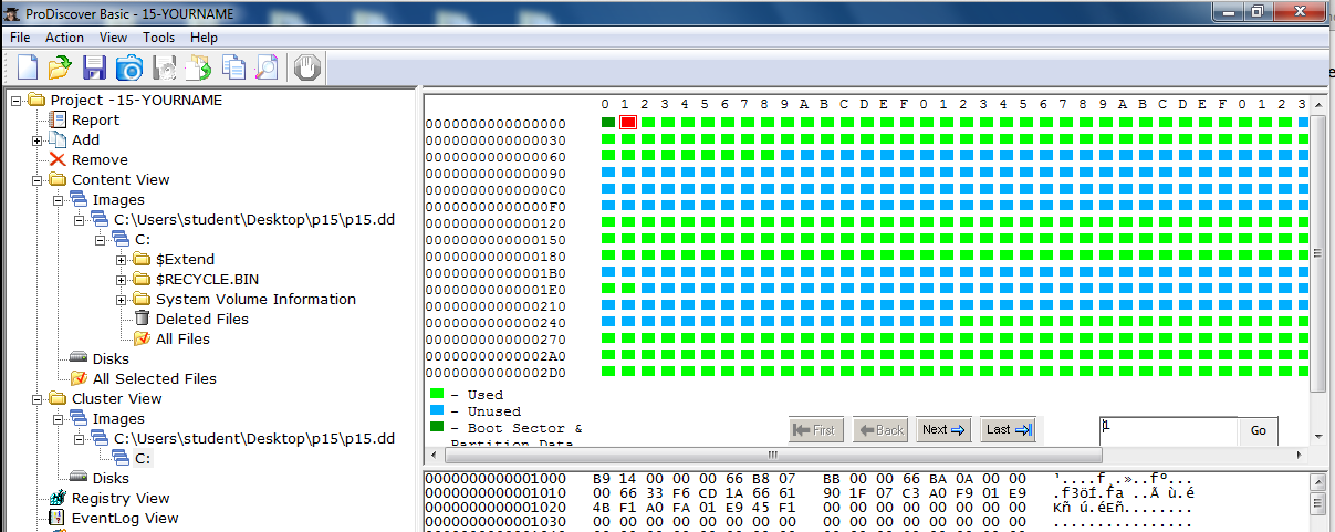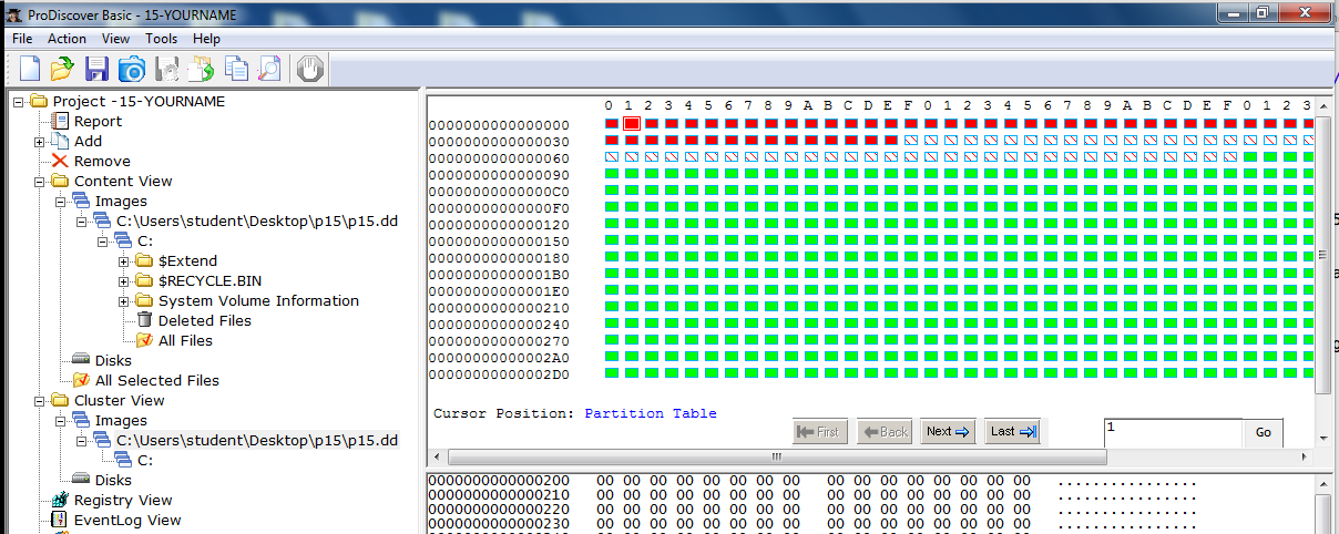 Click the first red rectangle, cluster 0. In the lower right pane, notice that it starts at address 0, as shown below.