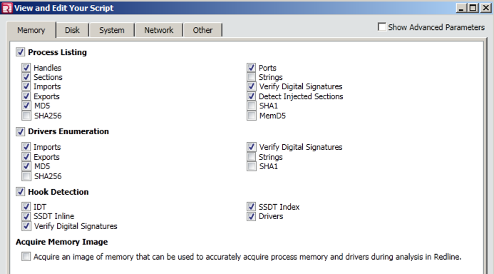It will collect running processes, drivers, and "Hooks" (which are frequently used by malware). Leave these settings at their default values.