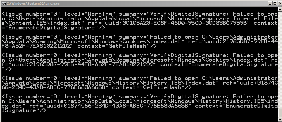 Note: This is not the recommended way to use Redline, because it stores the results on the evidence system, potentially overwriting data that could be important. The proper procedure is to put the collector on a removable device or a network share and run it from there. We are doing it this way just to make the project simpler.A black command prompt window opens, and messages scroll by, as shown below. Many of them are warnings, but none should be errors.