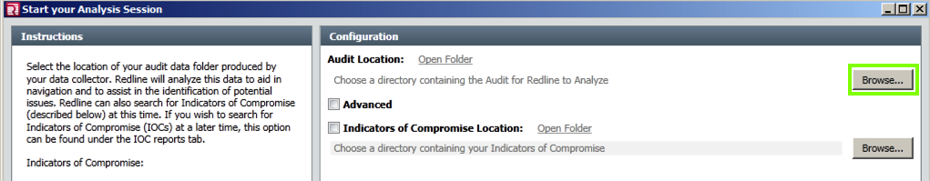 In the "Start your Analysis Session" window, at the top right, in the "Audit Location" section, click the Browse... button, as shown below.