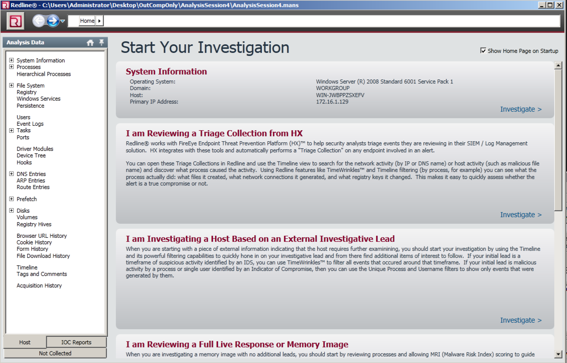 In the right pane of the "Start Your Investigation" window, at the bottom, click "I am Reviewing a Full Live Response or Memory Image".