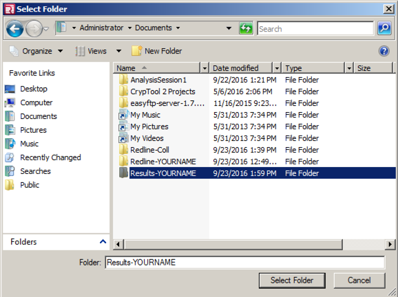 In the "Select Folder" box, navigate to the Redline-YOURNAME folder you created, and click on it, as shown below.