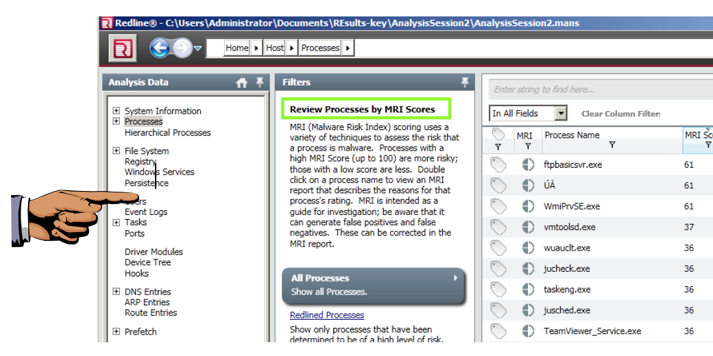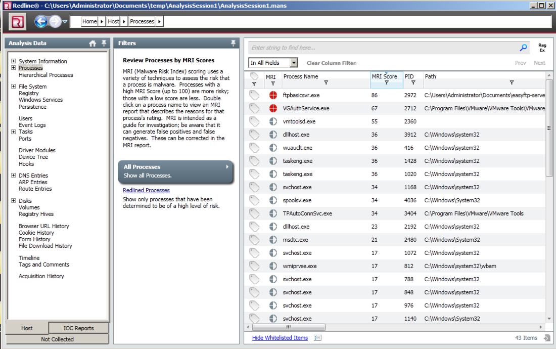 Redline finds two suspicious processes and labels them with a red icon, as shown below.