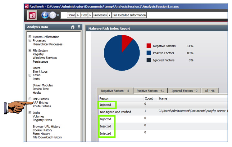 Double-click the ftpbasicsvr item. A "Malware Risk Index Report" opens. At the bottom, click the "MRI Report" tab.