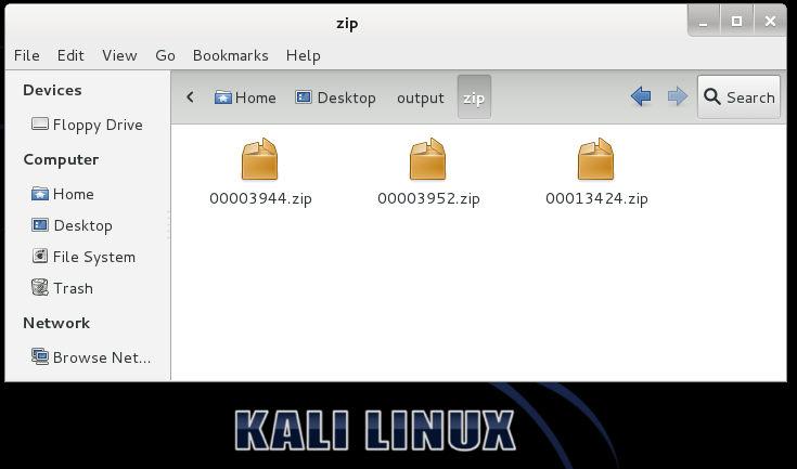 Double-click one of the recovered ZIP files. Kali Linux can't open it.