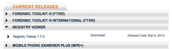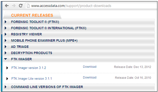 In the "Current Releases" section, expand the "FTK Imager" section, as shown below. On the "FTK Imager Lite version 3.1.1" line, click Download.