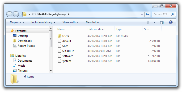 On your desktop, open the YOURNAME-RegistryImage folder. It should contain the five files and one folder shown below. You should get used to seeing these names--they are the Hive Files, and a lot of forensics involves working with them.