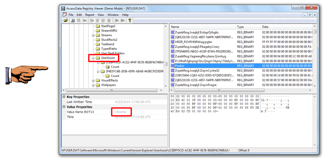 The upper right pane of Registry Viewer now shows strange unreadable "Name" values. Believe it or not, these are obfuscated with ROT-13--moving each letter 13 values in the alphabet, an ancient and very weak form of encryption.