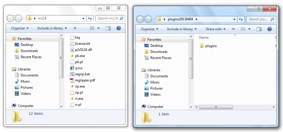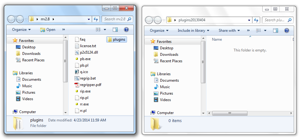 Drag the plugins folder from the "plugins20130404" window and drop it into the "rrv2.8" window.