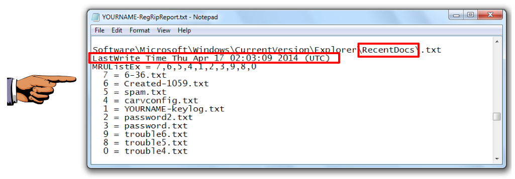 Scroll down to see some recently opened files and the "LastWrite Time", as shown below.